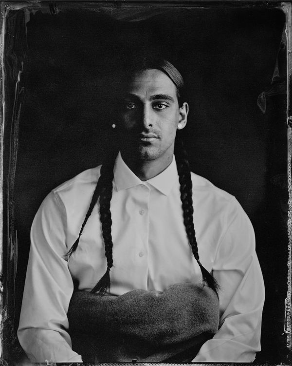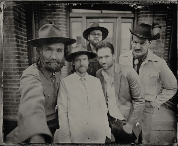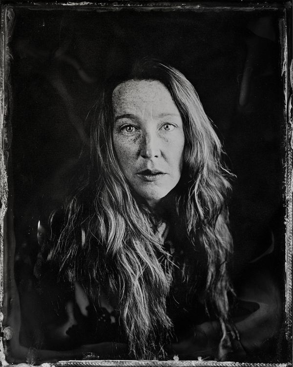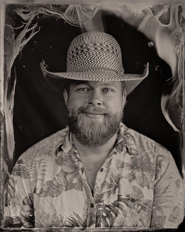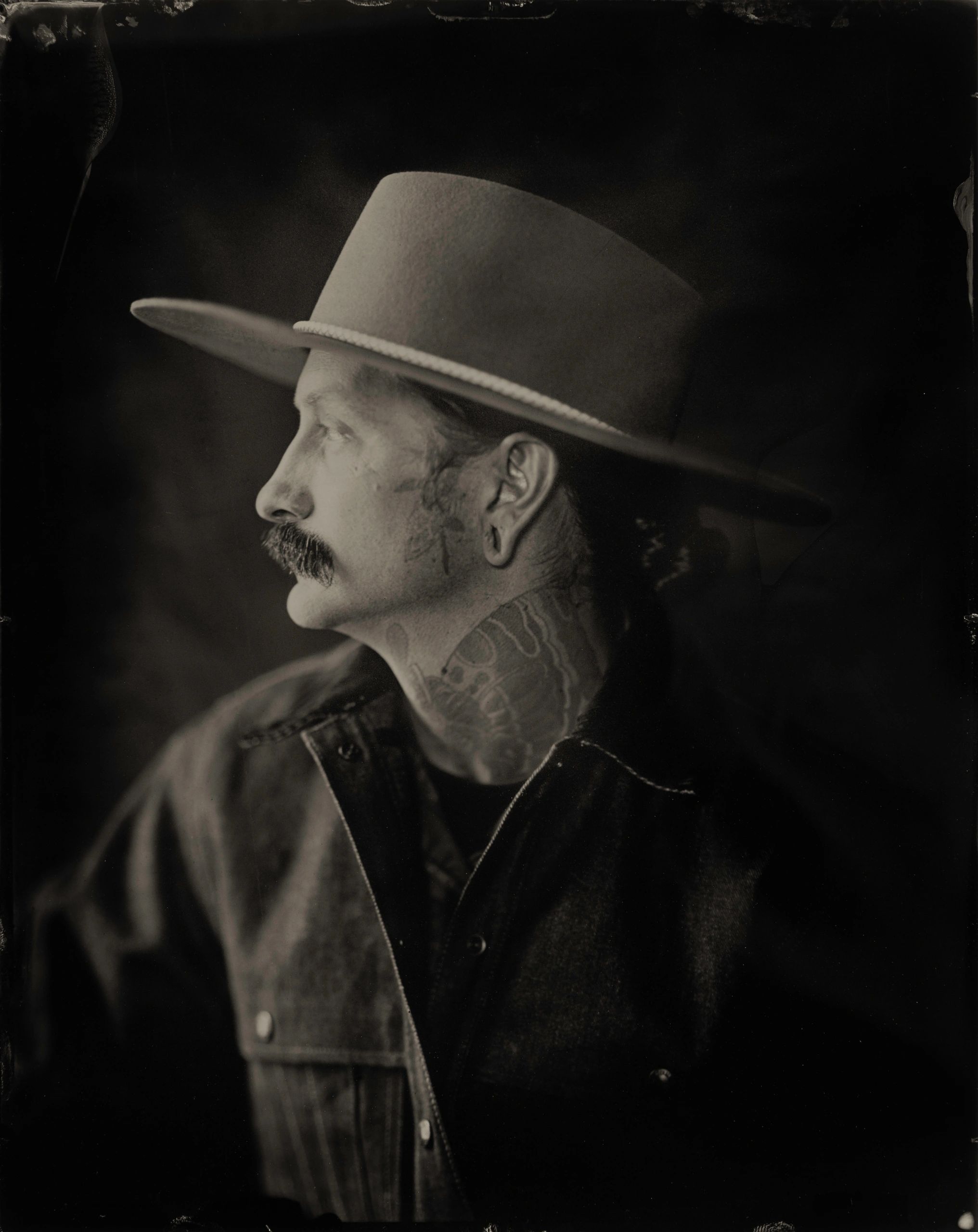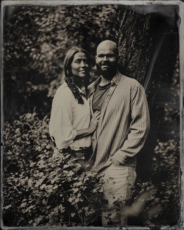 Tintype images date to the mid 1850s. I mix chemicals in the open air and and then sensitize and load the plate into a holder in the dark to shoot while still wet. You can expect a little dust, some strange awesome unexpected results in the form of streaks, and marks due to time, temperature, and chemical shenanigans.